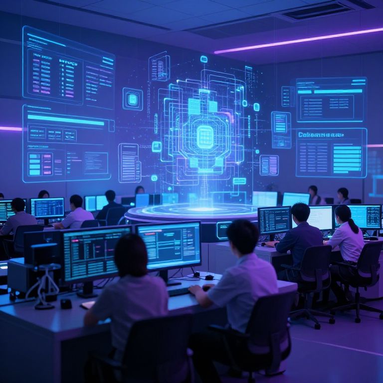 Photograph of a modern, tech-filled control room bathed in blue neon light. A large, illuminated digital circuit diagram dominates the background, surrounded by various data screens. Dozens of people, mostly men, in white shirts sit at desks, focused on computer monitors displaying complex blue and white text. The room features sleek, dark office furniture and a central round table with a glowing base. The atmosphere is intense and futuristic, with a strong emphasis on technology and data analysis. The overall color scheme is dominated by blue and white hues.