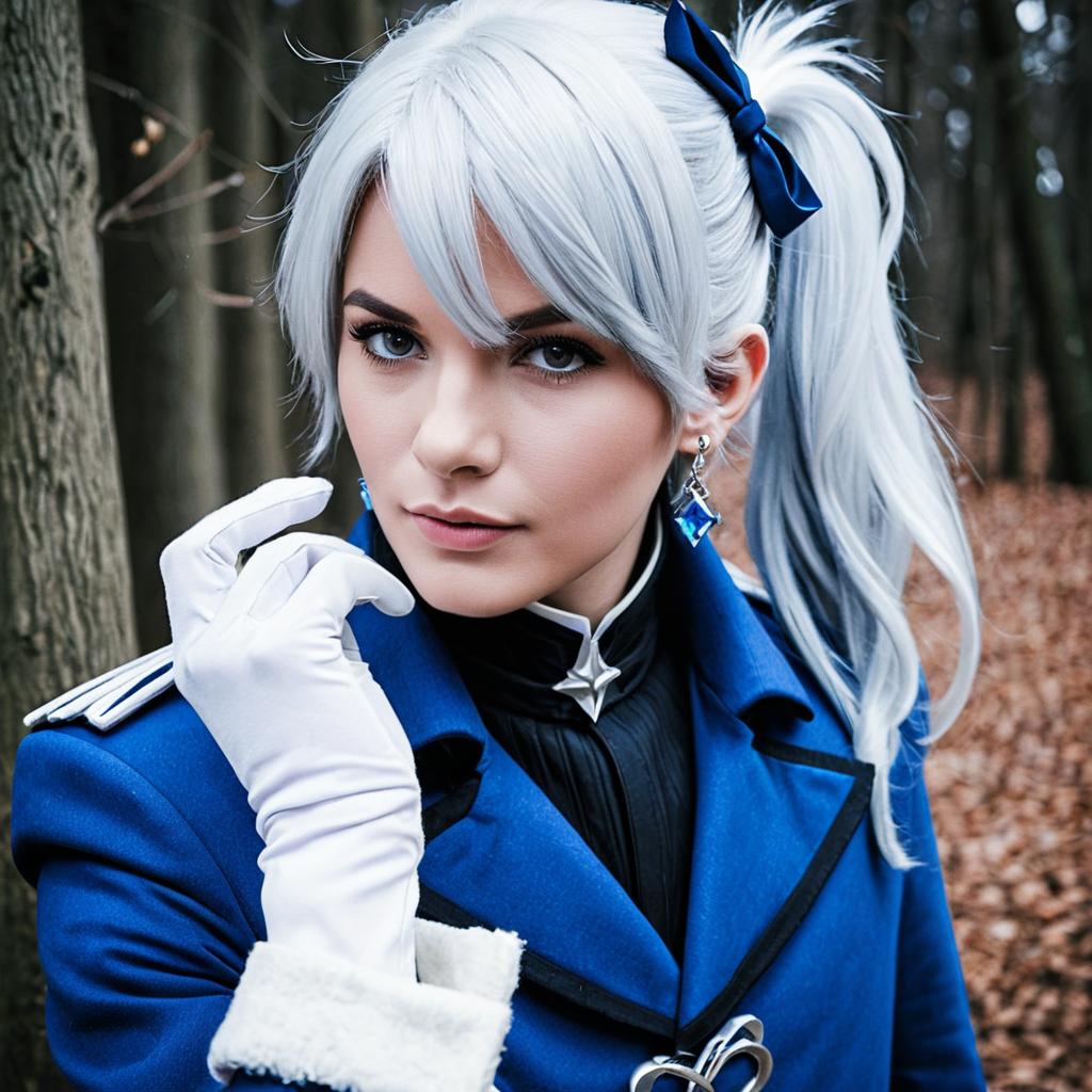 Photo-realistic cosplay photo of person in alphinaud leveilleur costume. 1boy, blue eyes, hair between eyes, hair over one eye, white hair, long hair, grey hair, ahoge, ponytail, hair ribbon, white gloves, blue coat, earrings, elezen, earclip