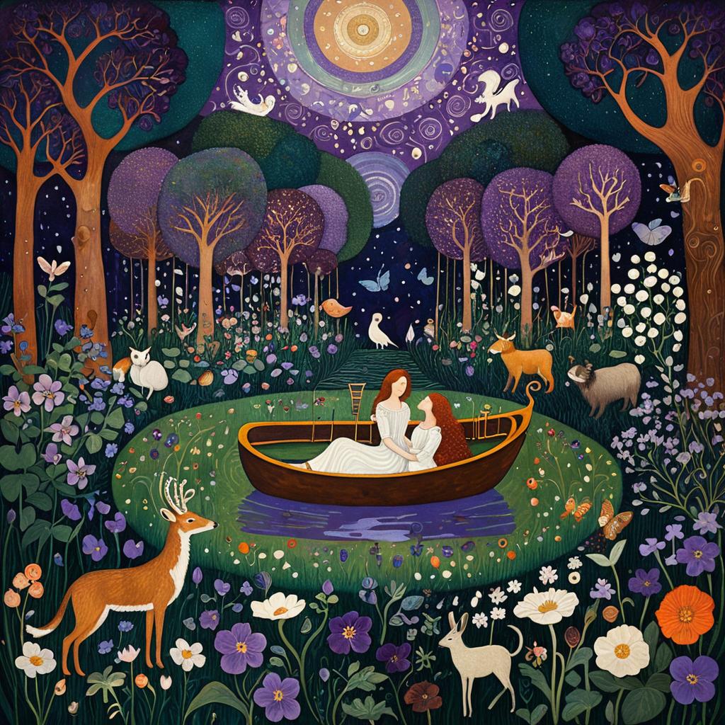 Digital painting of a surreal cityscape at night featuring illuminated buildings and a starry sky with swirling galaxy patterns. Silhouettes of a man and woman stand in the foreground on a reflective street, surrounded by mysterious figures and glowing windows.