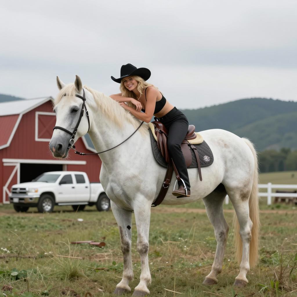 Woman with blonde ponytail, white cropped sweater, high-waisted blue jeans, brown boots, leaning on wooden fence, feeding brown horse with bridle, another horse with white patches in background, forest and mountains in clear blue sky. Two people, daytime, outdoor, farm setting.