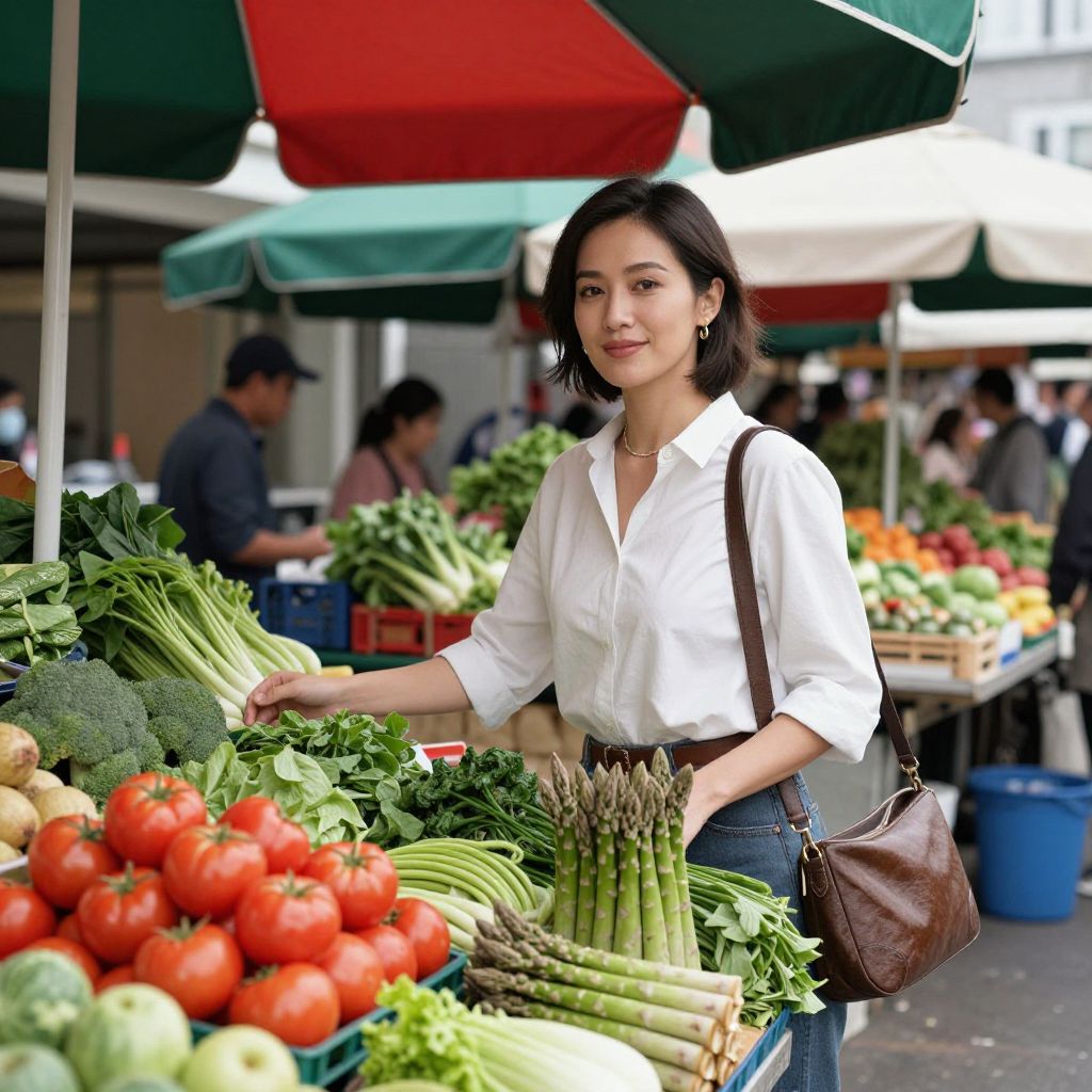 Woman stands gracefully at a vibrant vegetable stall, surrounded by an array of fresh produce including tomatoes, broccoli, asparagus, and leafy greens, while a bustling market scene unfolds behind her under colorful awnings.