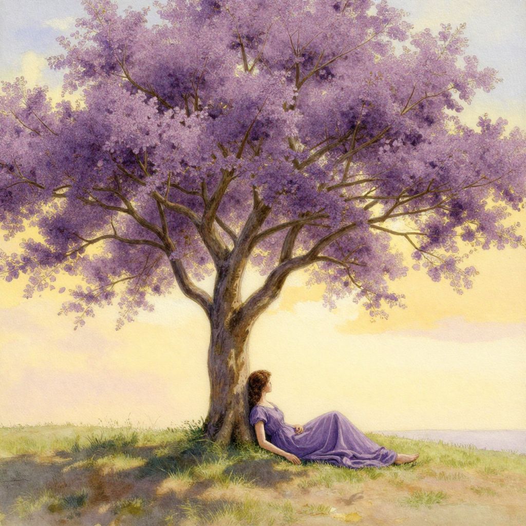 In this highly detailed, watercolor-style painting, a woman in a flowing purple dress is seen resting under a majestic tree adorned with vibrant purple blossoms. The tree, with its intricate branches and lush foliage, stands prominently in the foreground, casting a gentle shadow on the ground. The woman, with her back turned, appears to be lost in thought, her gaze directed towards the horizon. The background features a warm, yellowish sky, adding a sense of depth and warmth to the scene. The overall composition is balanced, with the tree and the woman positioned centrally, creating a harmonious visual rhythm. The interplay of colors, from the deep purple of the blossoms to the soft yellows and greens of the tree and the sky, creates a serene and contemplative atmosphere. The textures of the tree bark, the soft folds of the dress, and the delicate petals of the blossoms are rendered with meticulous detail, enhancing the realism and depth of the painting.