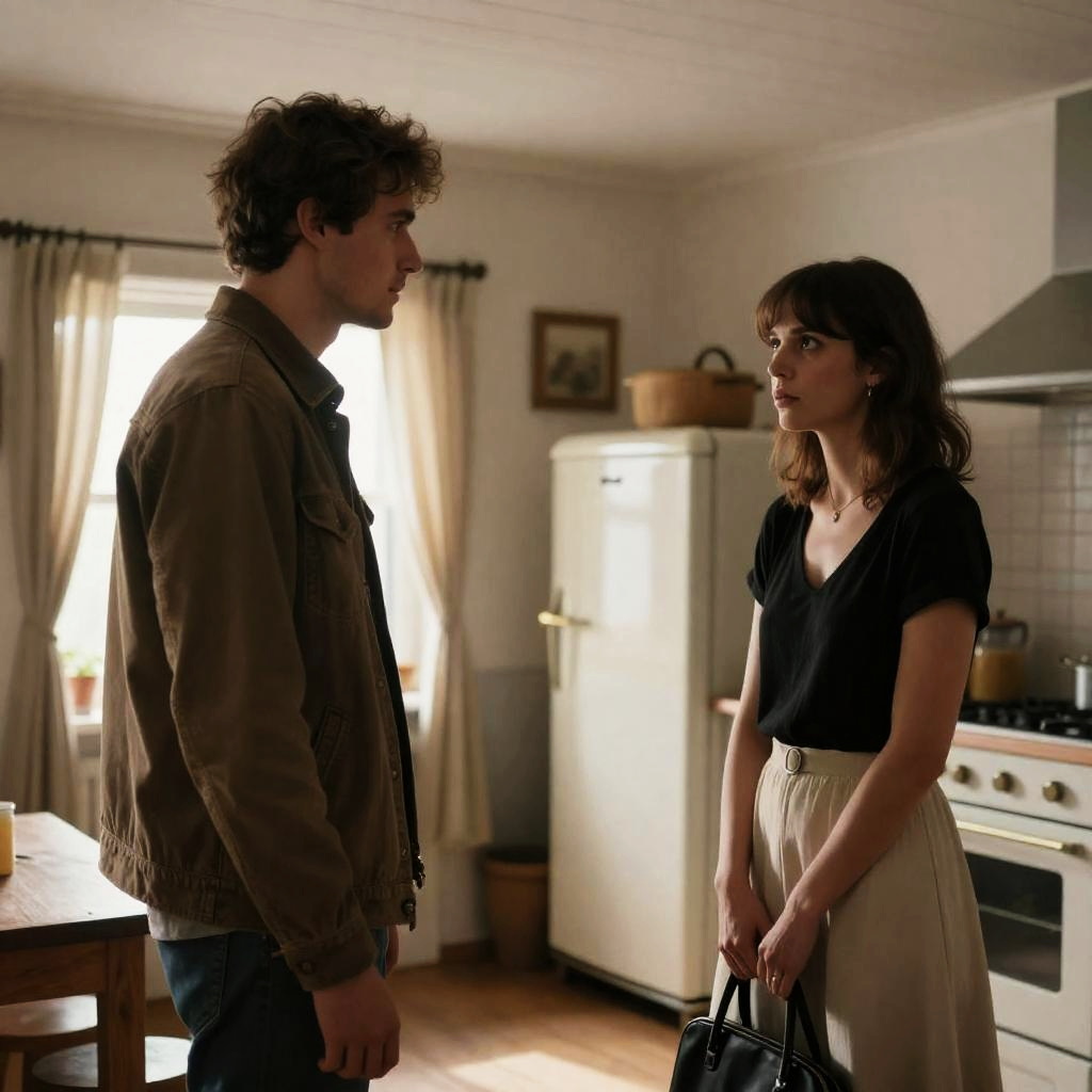 Photograph of two people in a rustic kitchen. Woman with shoulder-length brown hair, wearing black top and beige skirt, holding a black bag, facing a man with short brown hair, wearing brown jacket and blue pants. Woman has intense expression. Kitchen has white wooden ceiling, vintage refrigerator, curtains, and a small table. Man stands to the left, woman to the right.