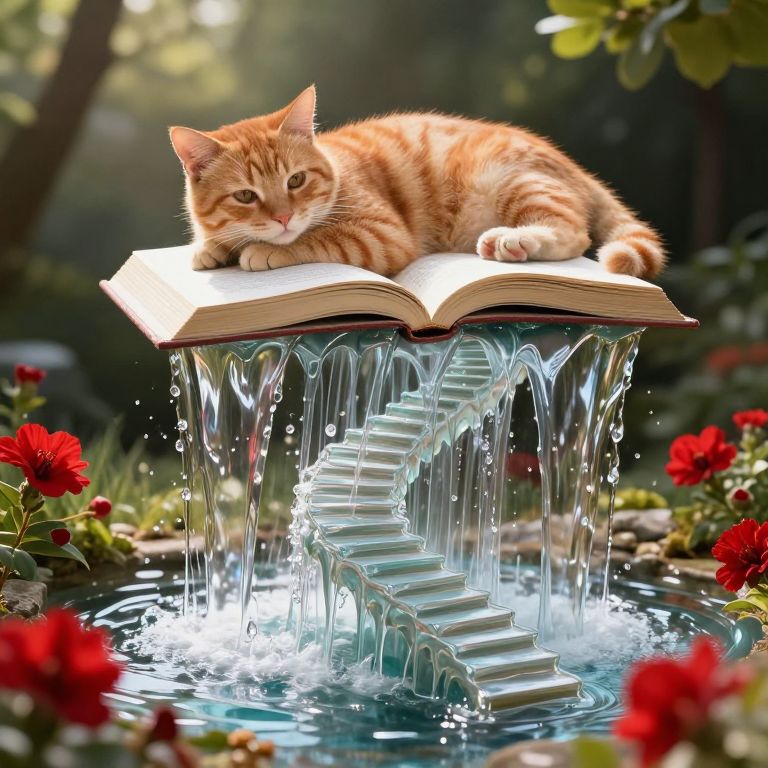 A serene orange tabby cat lounges atop an open book, its weight causing the pages to sag and transform into a cascading waterfall of liquid glass that forms a graceful, ethereal staircase descending into the ground, surrounded by vibrant red flowers and dappled sunlight.
