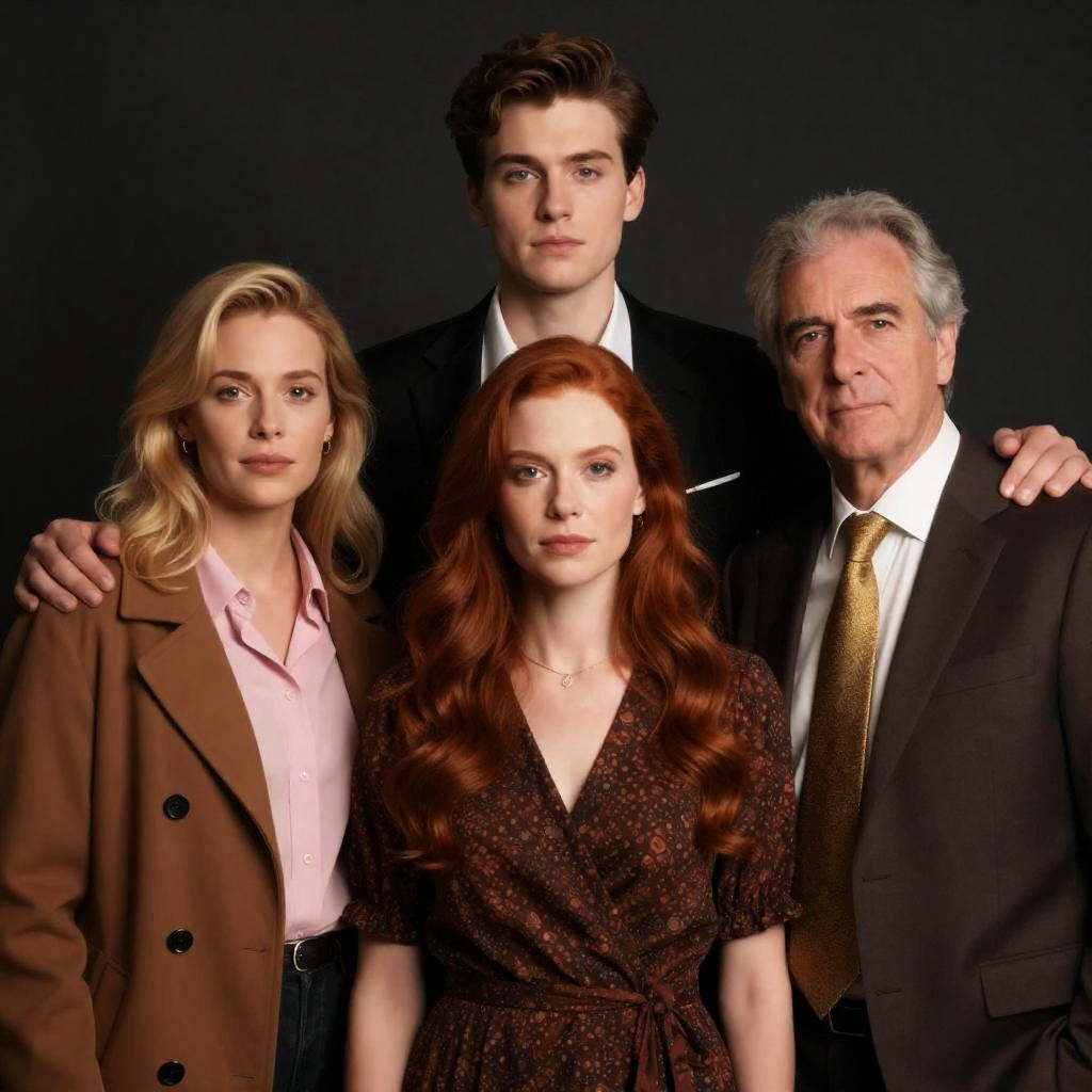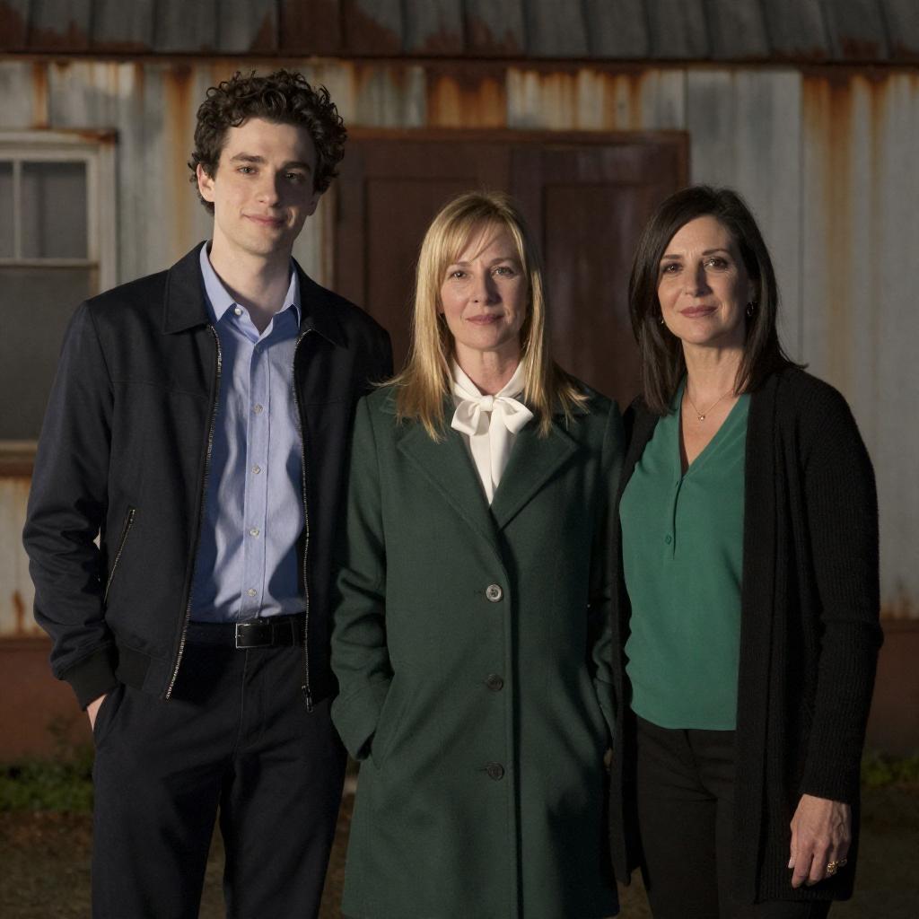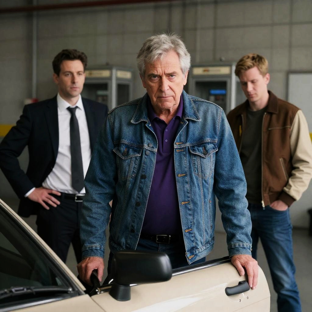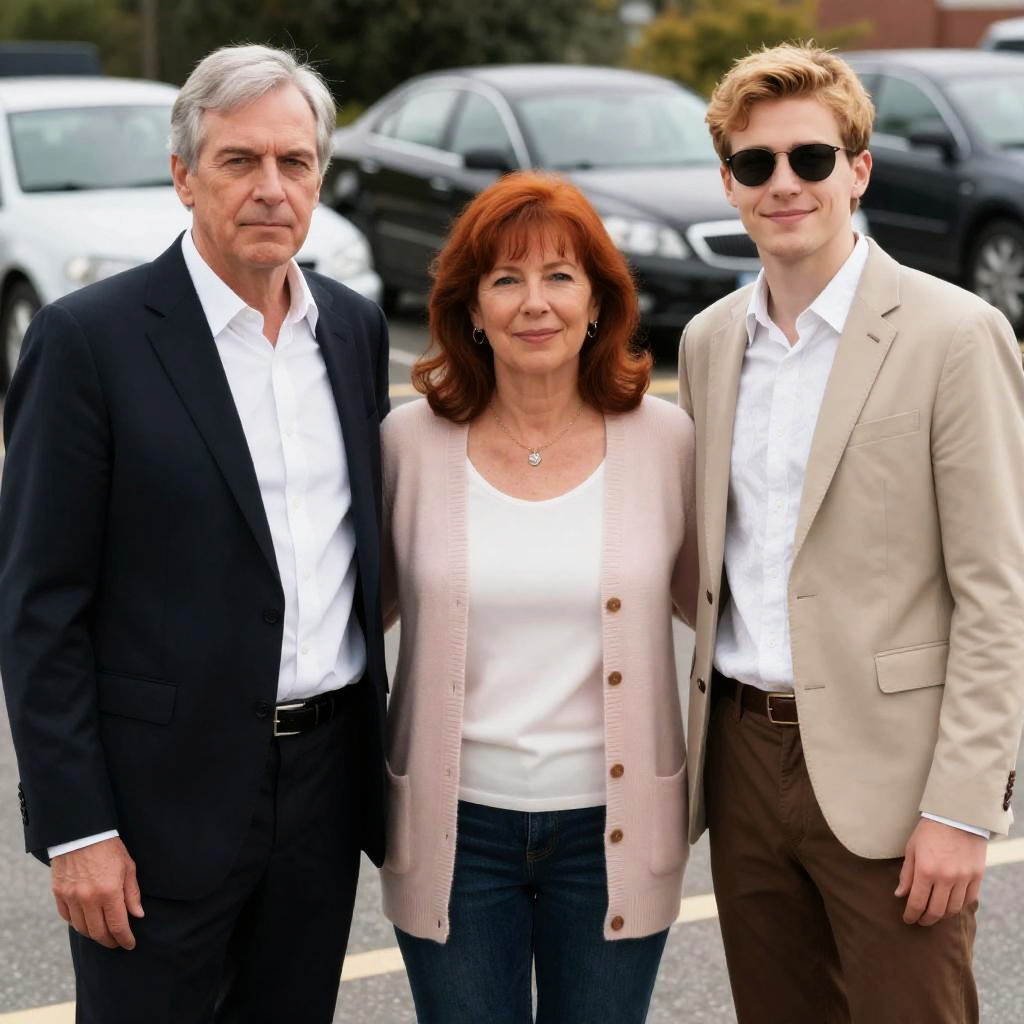 Photograph of three people standing in a parking lot. A middle-aged man with gray hair in a black suit and white shirt stands on the left. A red-haired woman with a light pink cardigan and white top stands in the center. A young man with short blonde hair, sunglasses, and a beige blazer over a white patterned shirt stands on the right. Parked cars in the background. The man on the left has a serious expression, the woman smiles subtly, and the man on the right smiles slightly.