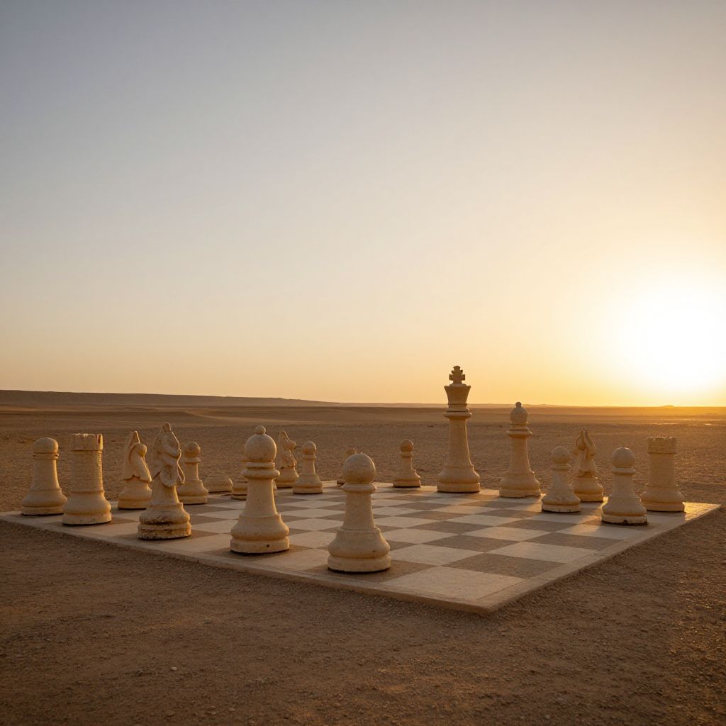 Enormous, weathered stone chess pieces stand solemnly in a vast desert landscape, their ancient forms bathed in the golden light of the setting sun, evoking a timeless, otherworldly tableau where the game of strategy transcends human existence.