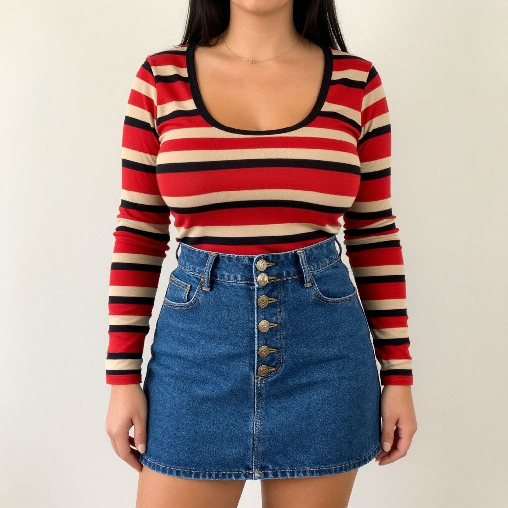 Photograph of a woman from the shoulders to the upper thighs, wearing a red, white, and black striped long-sleeve shirt with a scoop neckline, and a high-waisted, button-down denim skirt with four brass buttons. She has long black hair and a thin gold necklace. The background is plain white, highlighting the colorful and textured clothing. The denim skirt has visible stitching and pockets, while the shirt fits snugly, accentuating her figure. The image has a crisp, clear quality.