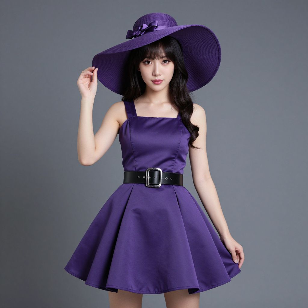 Photograph of an East Asian woman with fair skin and long black hair, wearing a sleeveless, purple A-line dress with a black belt featuring a silver buckle. She has on a wide-brimmed, purple hat adorned with a small bow on the side. Her right hand holds the hat's brim. She stands against a plain, gray background, gazing directly at the camera with a neutral expression. The dress's fabric appears smooth and slightly shiny, while the hat has a textured, woven pattern. Her makeup is minimal, emphasizing natural beauty.