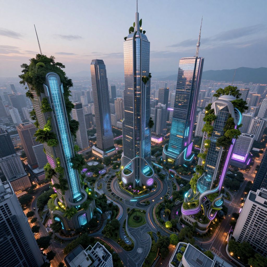 Digital CGI of a futuristic cityscape at dusk featuring illuminated, towering skyscrapers with neon lights, greenery, and winding roads.