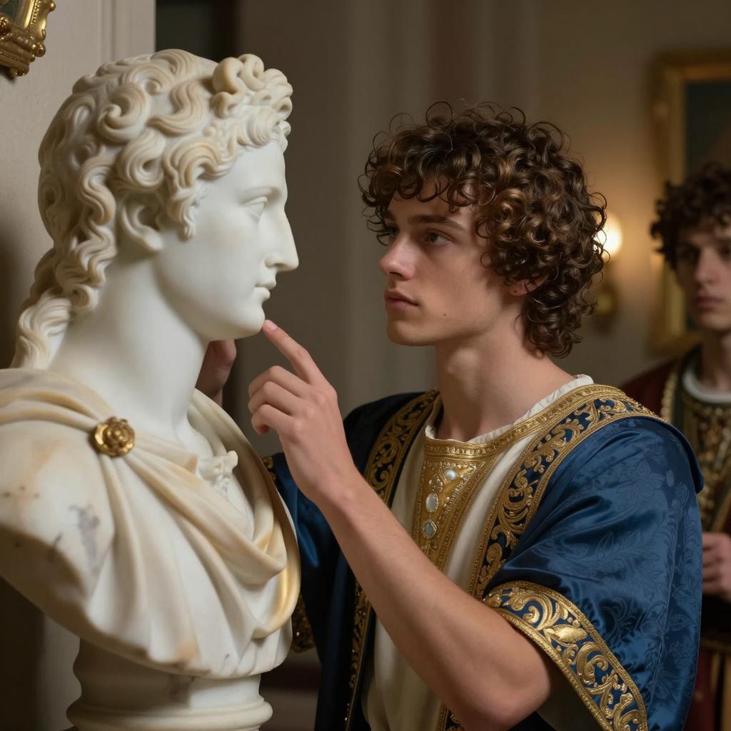 Young man with curly brown hair, wearing a blue and gold ornate robe, touches a marble bust's cheek with his right hand. The bust has curly hair and a gold cloak. Background has warm, dim lighting and blurred antique objects. Two people, man on right, bust on left. Intense focus on man's face, calm expression. Image has a cinematic style.