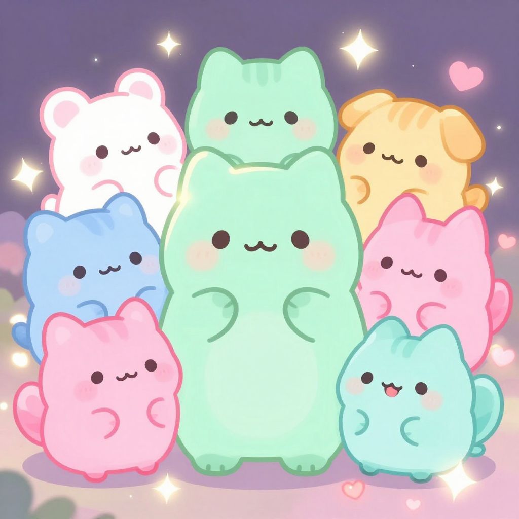 Kawaii sparkles glowing around adorable anime-style animals with vibrant colors, bubblegum pink and mint green palette, soft lighting, whimsical fantasy setting with heart-shaped sparkles