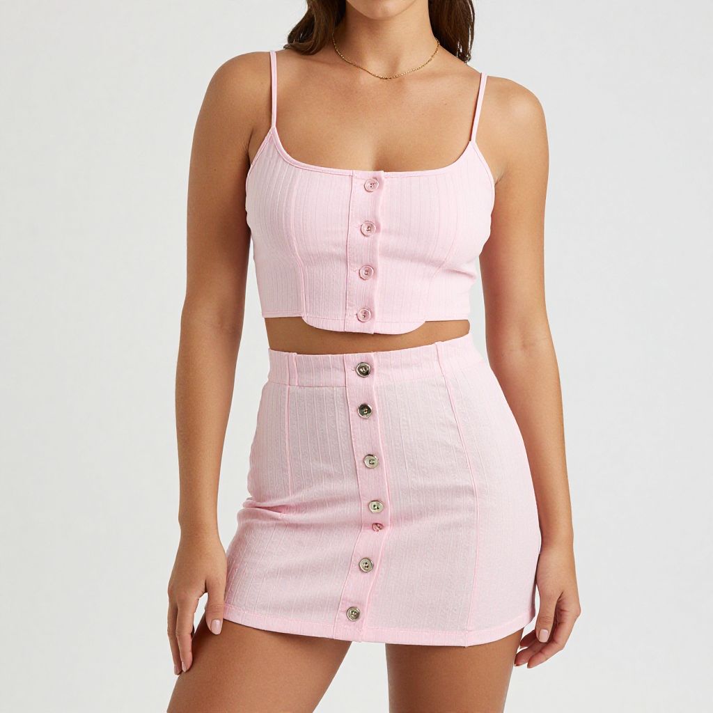 "Woman, contemporary casual, cropped spaghetti strap top in pastel pink, square neckline, button-up front, paired with a matching high-waisted miniskirt, center front button closure, both with a subtle vertical rib texture, coordinating strappy heeled sandals, minimal jewelry, white studio background.. Sexy. Pretty face and beаutiful eyes. Big breasts."
