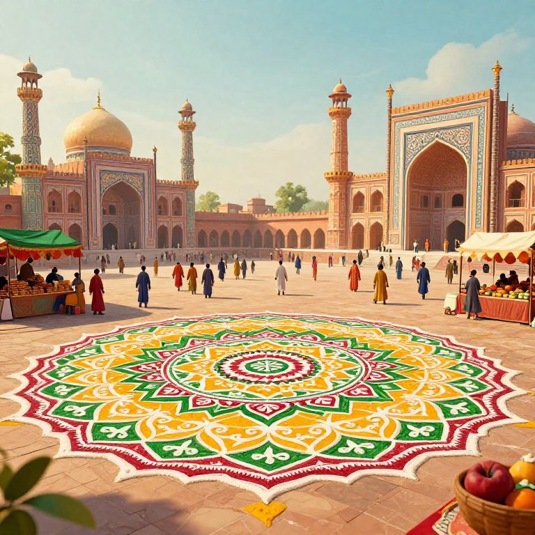 Pakistani prompts: A vibrant, culturally rich digital artwork depicting traditional Pakistani motifs like rangoli patterns, saffron and green hues, with elements of architecture such as minarets and bustling market scenes, rendered in a modern cinematic style with soft lighting and intricate details.