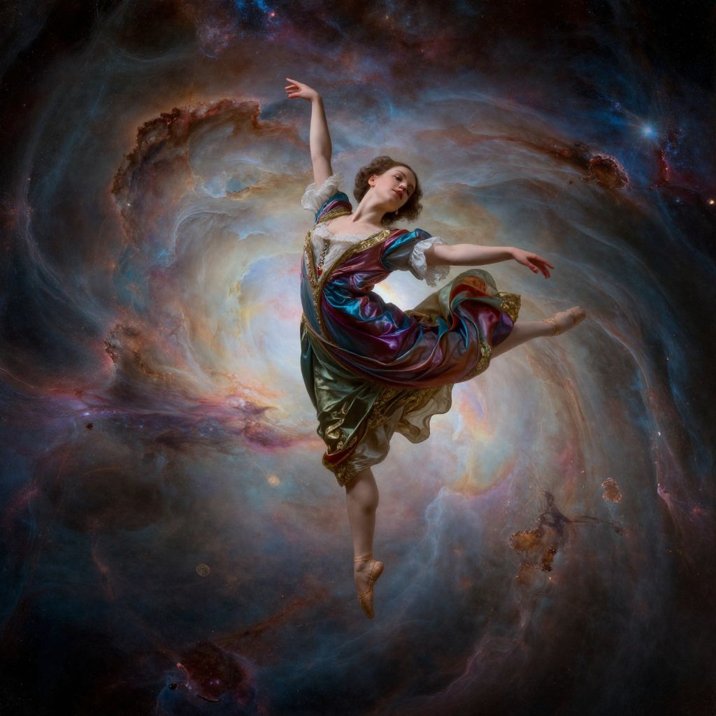 An exquisite portrait of a celestial dancer gracefully leaping through a shimmering nebula, capturing her in the enchanting style reminiscent of 18th-century Baroque painting. From an elevated perspective, the vibrant hues of the cosmic cloud intermingle with the luxurious fabrics of her elaborate costume, while soft, ambient light casts dramatic shadows across her movements. The dance conveys a sense of both wonder and melancholy, evoking a profound emotional response from viewers as they marvel at this celestial being's ethereal beauty and tragic fate within the boundless cosmos.