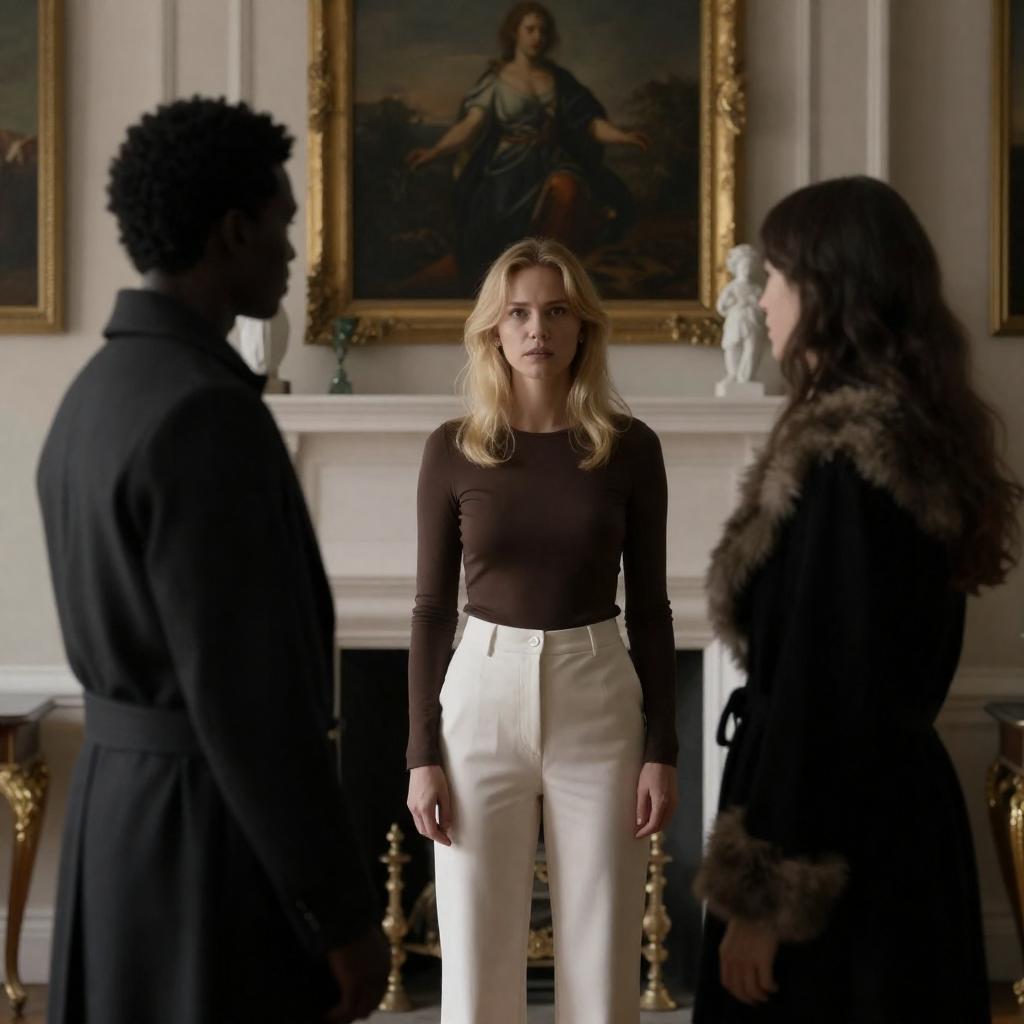 Blonde woman with shoulder-length hair, wearing brown long-sleeve top and white pants, stands in front of a white fireplace. Silhouetted figure in dark, fur-trimmed robe faces her. Elegant room with paintings, sculptures, and fireplace mantel. Intense facial expression on woman. Number of people: 2.