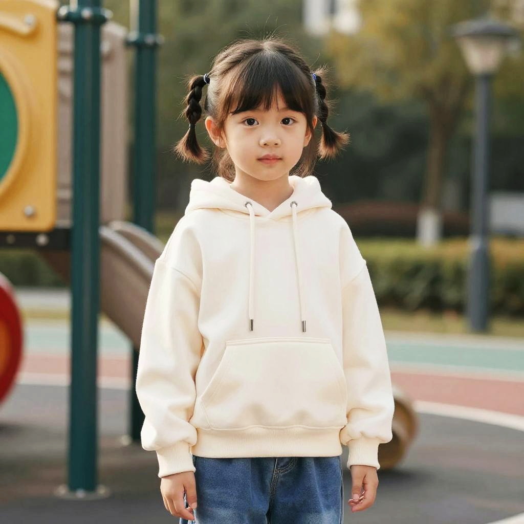 Mini Twists hairstyle on child model, wearing casual hoodie and jeans, in playground, captured in fashion editorial style with diffused morning light.