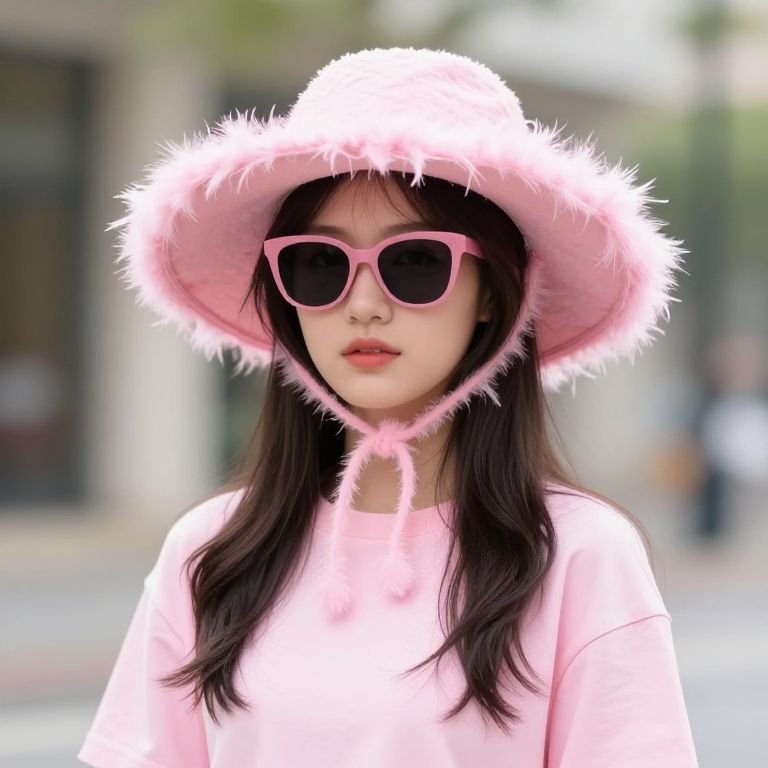 Female, wearing a pink outfit with a pink feather bookey hat and sunglasses.