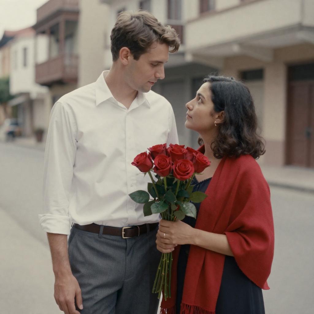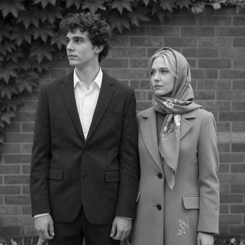Black-and-white photograph of three people in an outdoor setting. A tall man in a light shirt stands on the left, gently touching the chest of a blonde woman in a white blouse. She looks up at him, while a woman with a polka-dot dress and headscarf stands to the right, observing. Background includes a thatched roof and potted plants.
