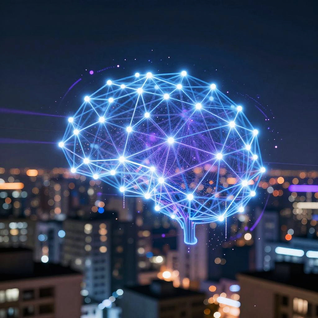 An abstract representation of photo generating AI free technology, featuring a blend of colorful pixels, neural network diagrams, and futuristic cityscapes merging together as if created by an intelligent algorithm, symbolizing limitless creative possibilities.