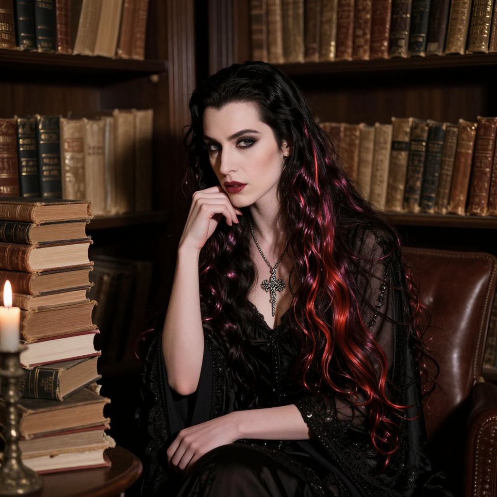 Gothic woman with long, wavy black and red hair, wearing a black lace dress, sits in a dimly lit library, surrounded by