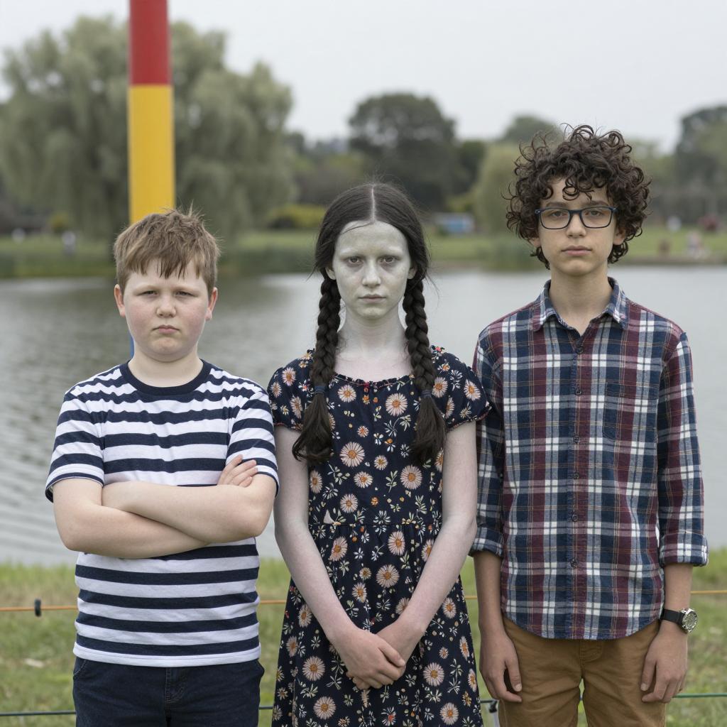 A group of people in a brightly lit indoor setting. Central figure is a white male with pale skin, black hood, and white face makeup, smiling. To his left, a blonde boy in a red backwards cap and green plaid shirt with yellow t-shirt. To his right, a brown-haired boy in a red vest over a pink shirt. Background includes several other people, some smiling, some looking away. Arched windows in the background.