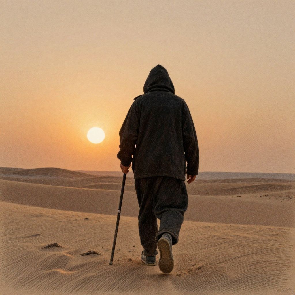 Photograph of a solitary figure in black hooded jacket and pants, using a cane, walking away from a glowing sunset over a sandy desert.