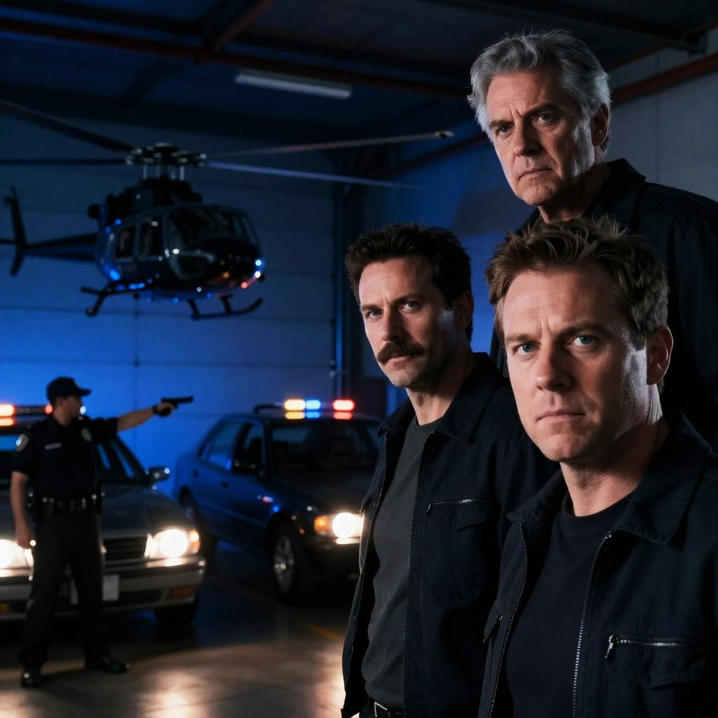 Portrait of two serious men standing side by side in a dimly lit room. The man on the left has dark hair and a beard, wearing a black leather jacket over a dark shirt. The man on the right has short light brown hair, light stubble, and is dressed in a dark jacket with a black shirt and tie. The background is blurred with soft, diffused lighting enhancing the intense mood.
