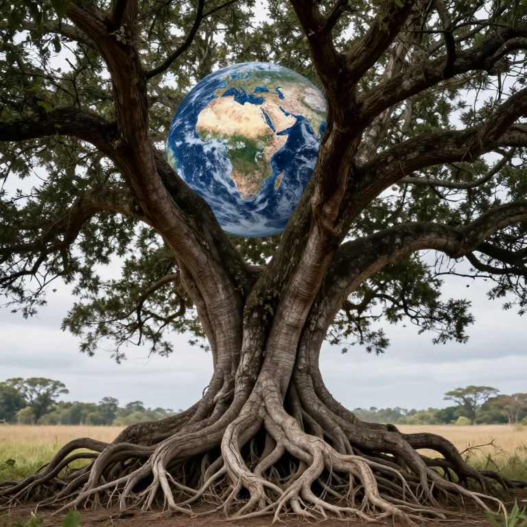 Photograph of a large, ancient tree with thick, gnarled roots spreading across the ground. The tree's dark brown bark is textured and rough. Suspended in the middle of the tree's branches is a vividly detailed, realistic image of Earth, showing Africa prominently in the center with blue oceans and white clouds. The background features a grassy field under a cloudy sky, with distant trees lining the horizon. The surreal combination of natural elements and the globe creates a striking visual contrast.