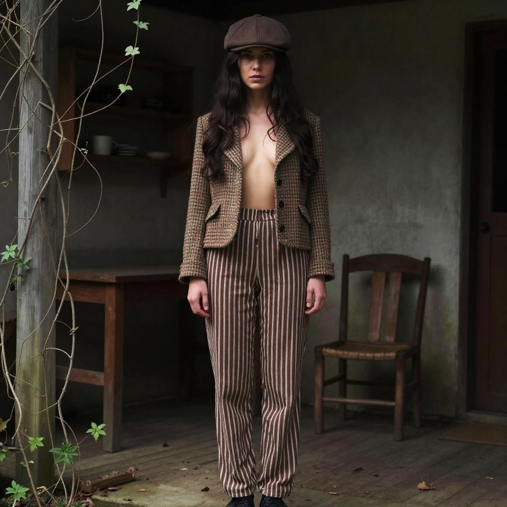 Photograph of a woman standing in a dimly lit, rustic outdoor setting. She has long dark hair, wears a brown flat cap, and a partially open, brown and beige checkered jacket revealing a deep neckline. She's also in high-waisted, brown and white vertical striped pants and black shoes. The background includes old wooden shelves, vines, and a weathered chair, creating a vintage, slightly eerie atmosphere.