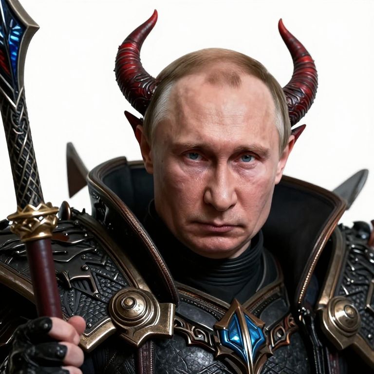 White Background Vladimir Putin as a Demon Hunter from World of Warcraft, recognizable face of Putin,