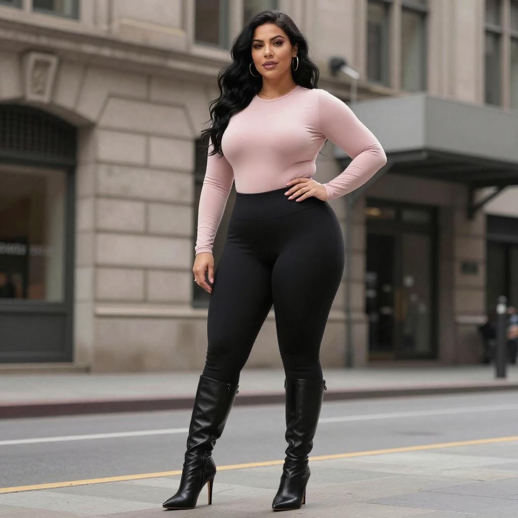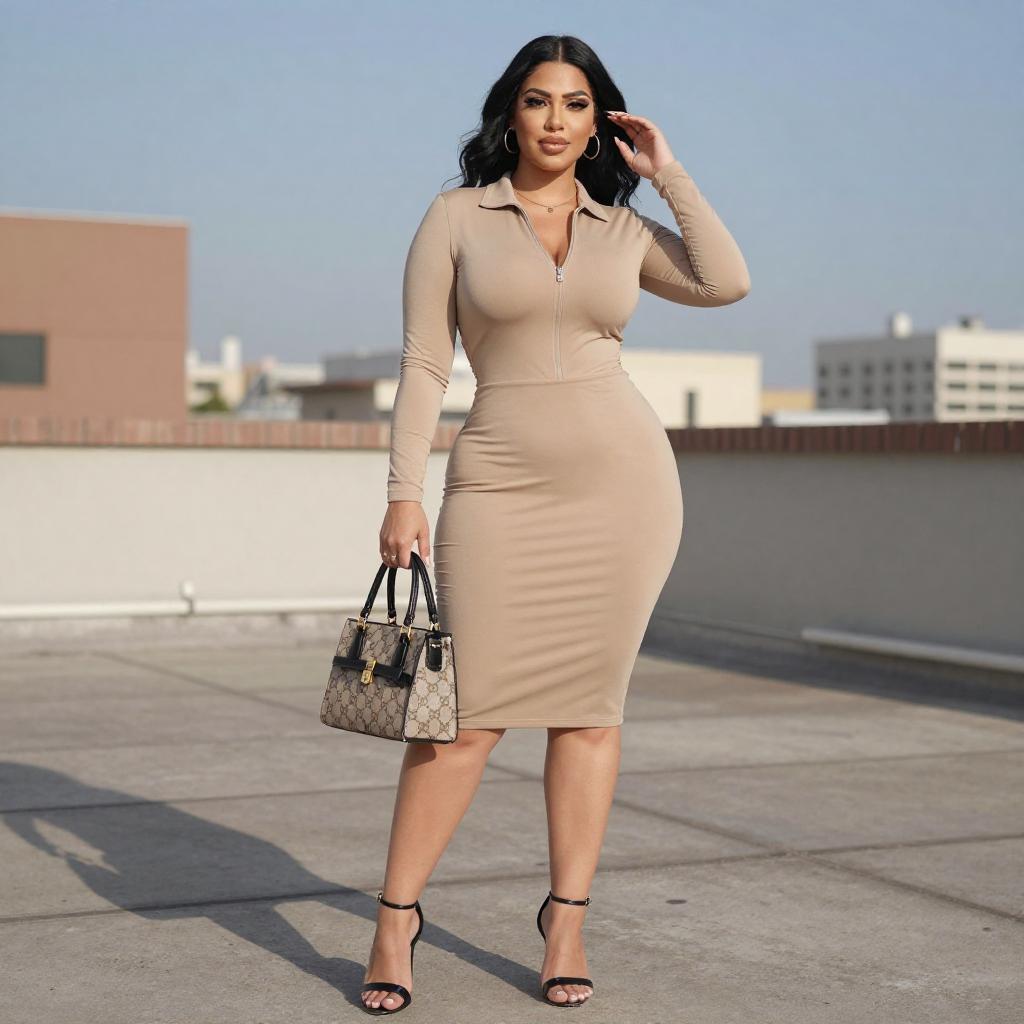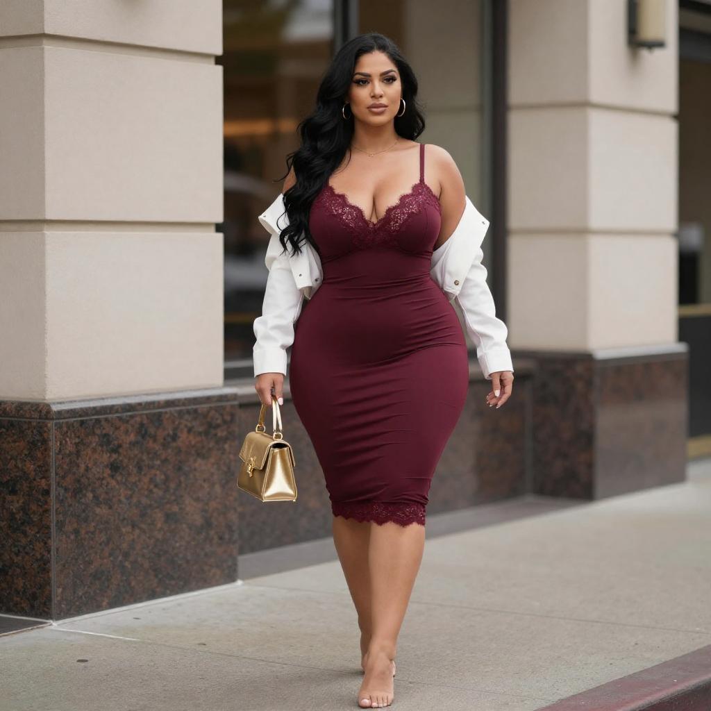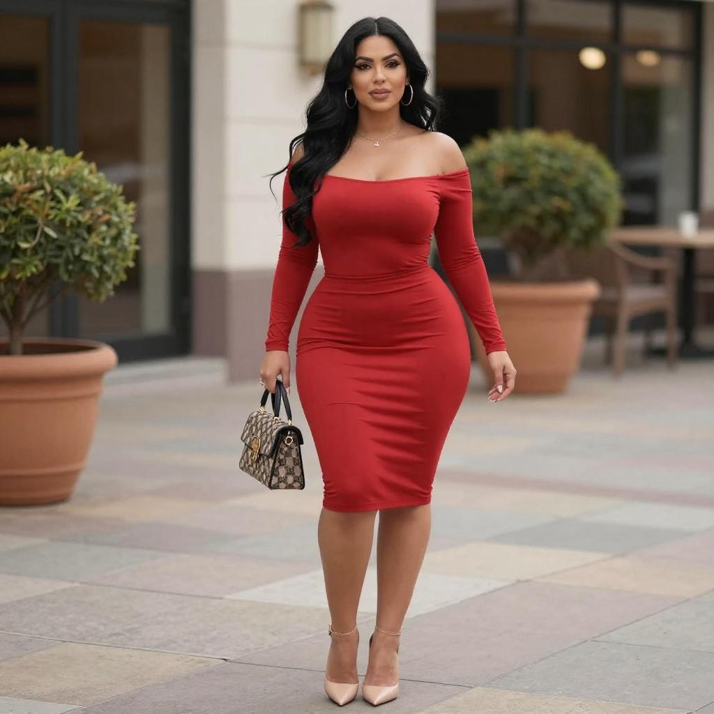 Photograph of a curvy woman with long, wavy black hair, wearing a tight, long-sleeved, hot pink dress with a wrap detail, and white high-heeled sandals. She holds a matching pink purse in her right hand, smiling confidently. She stands on a ured, beige marble sidewalk in front of a glass door.