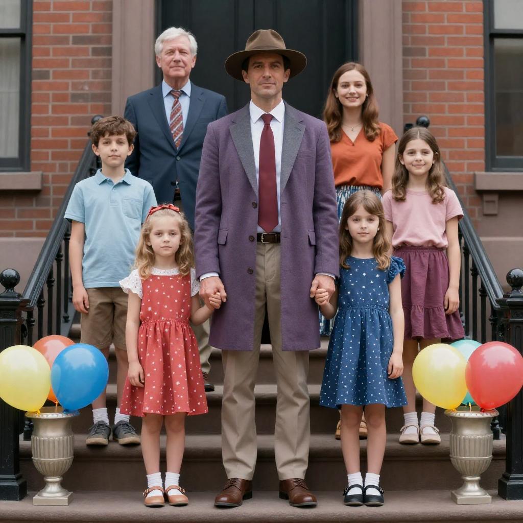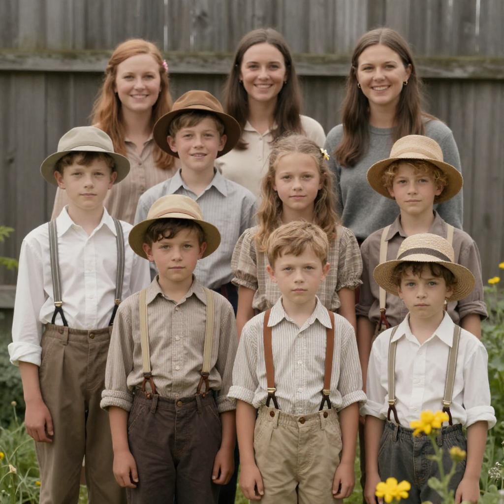 Photograph of six people standing in a grassy park. Adults and children holding hands, smiling. Adults wear 1940s-style clothes, children in pinafores and shorts. Green trees in background. Woman in green dress, man in gray shirt and hat. Children in front, one in black hat, another in striped dress. Sunlight filtering through trees.