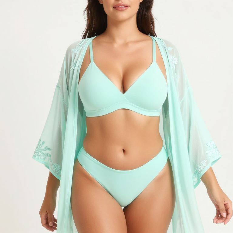 "Triangle bikini, pastel mint green, eco-friendly recycled polyester, classic triangle top, sliding cups, wide band underbust, high-cut Brazilian bottom, minimalistic design, soft-touch finish, lightweight kimono, sheer mesh, floral embroidery, flowing sleeves.. Sexy. Pretty face and beаutiful eyes. Big breasts."