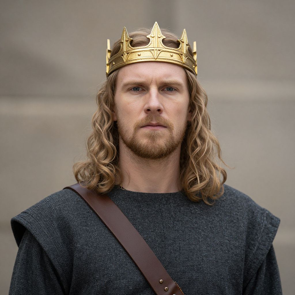 Photograph of a fair-skinned man with long, wavy blonde hair and a light beard, wearing a golden crown with intricate designs. He has a serious expression and is dressed in a dark gray, textured tunic with a brown leather strap across his chest. The background is a blurred, neutral-colored stone wall, giving the image a medieval vibe.