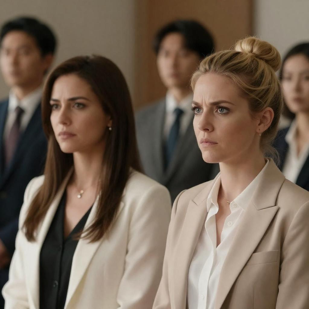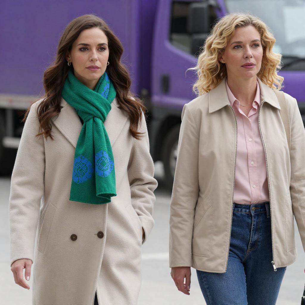Photograph of two women walking outdoors. The woman on the left has long brown hair, a beige coat, and a green scarf with blue patterns. The woman on the right has curly blonde hair, a beige jacket, and a pink shirt. Both have neutral expressions. A purple truck is in the background.