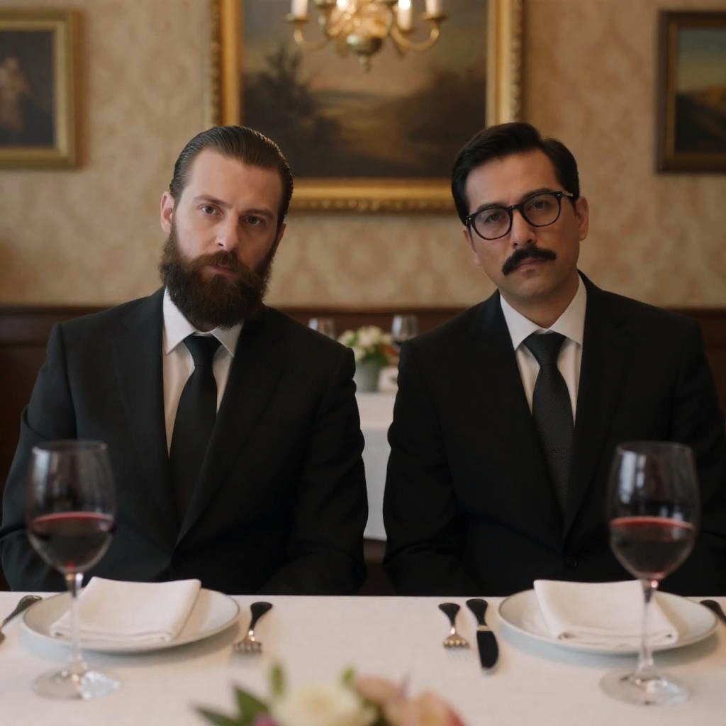 Photograph of two men in formal black suits and ties sitting at a dining table. Both have serious expressions. The man on the left has a full beard and slicked-back hair. The man on the right has a mustache and glasses. Both have glasses of red wine in front of them. The table is set with white plates, napkins, and silverware. The background includes patterned wallpaper, a framed painting, and a chandelier.