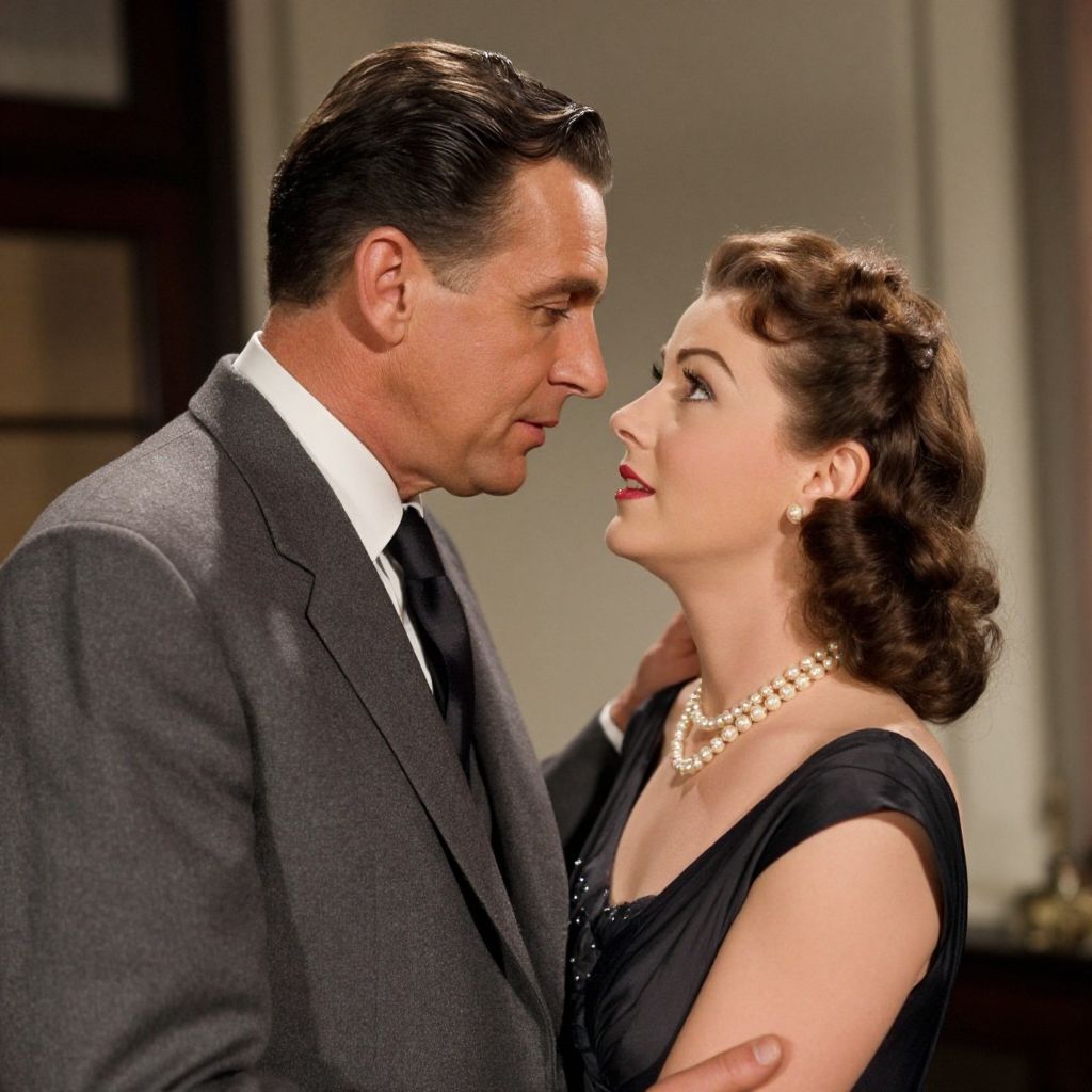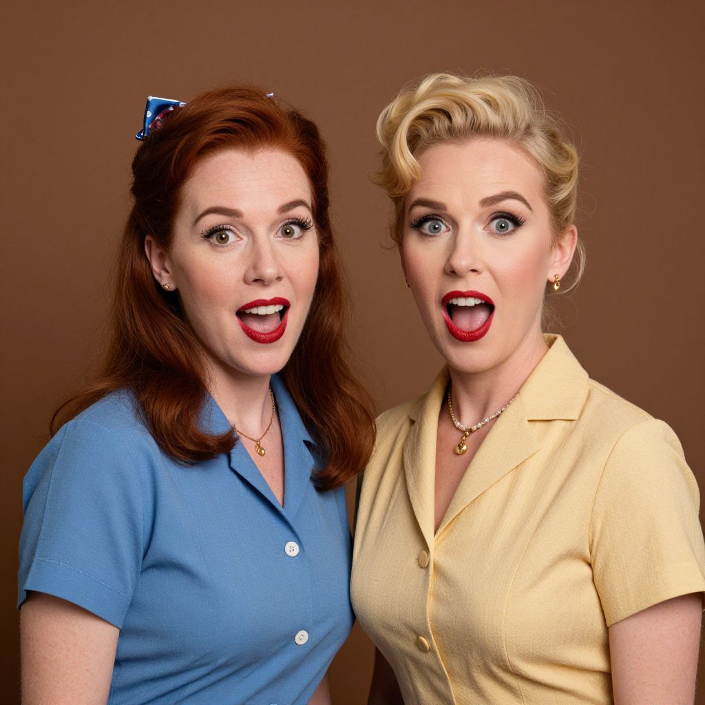 A couple, vintage clothing, selfie, eastman lpp, solarised, 1950s diner, retro colors, soft grain, woman in polka dot dress, man in leather jacket, playful pose, wide smiles, warm lighting, classic decor, jukebox in background, checkerboard floor, nostalgic ambiance Sexy. Pretty face and beаutiful eyes. Big breasts