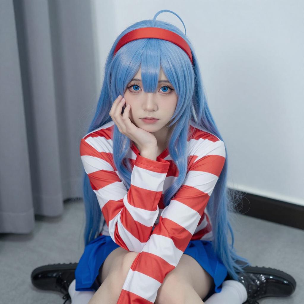 Photograph of a young woman cosplaying as a character with long blue hair, red headband, red and white striped long-sleeve shirt, and blue skirt. She sits on the floor, hand touching her cheek, with a neutral expression. Background includes white wall and gray curtains.