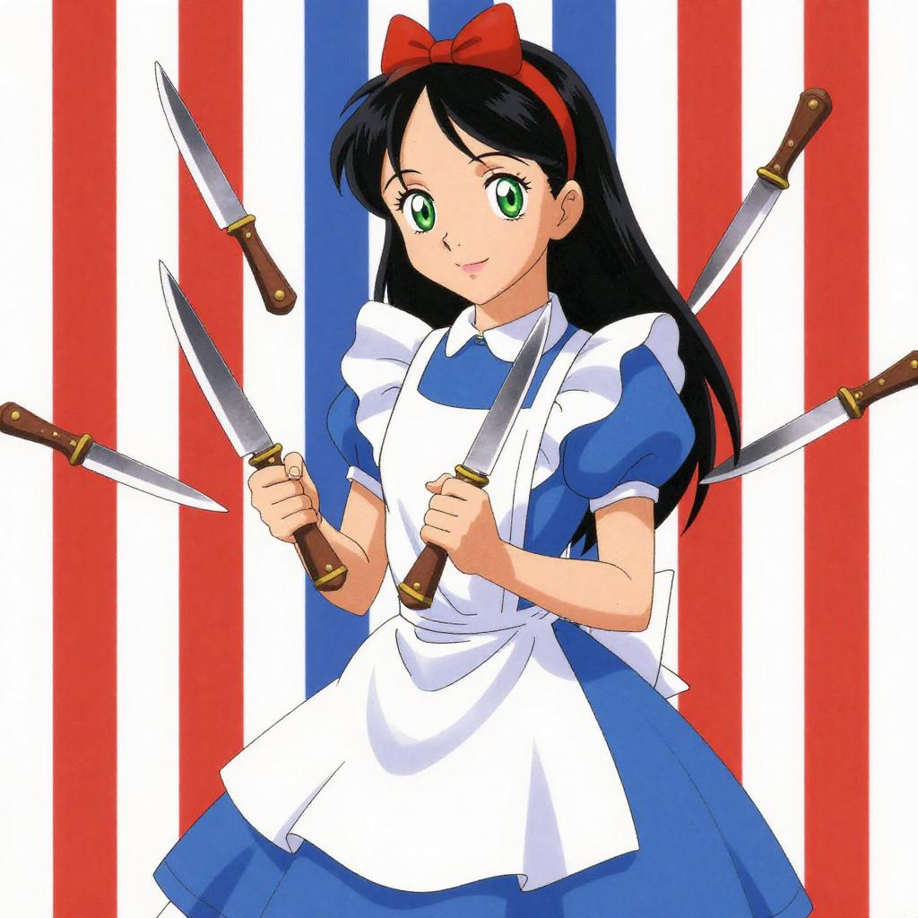 Anime-style illustration of a young girl with long black hair and green eyes wearing a colorful striped dress paired with a white and green apron. She is holding two knives and several more knives appear to float beside her against a vertically striped red, blue, and white background. The image is inspired by the character Alice Liddell from American McGee's Alice game, rendered with anime aesthetics.