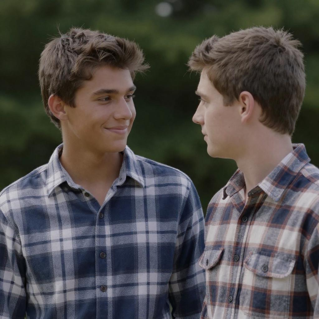 Photograph of two shirtless young men in a tiled bathroom. The man on the left, with short brown hair and a lean build, smiles while massaging the back of the man on the right, who has short dark hair and a muscular build. The man on the right laughs, showing his teeth. Warm, orange lighting highlights their wet, glistening skin.