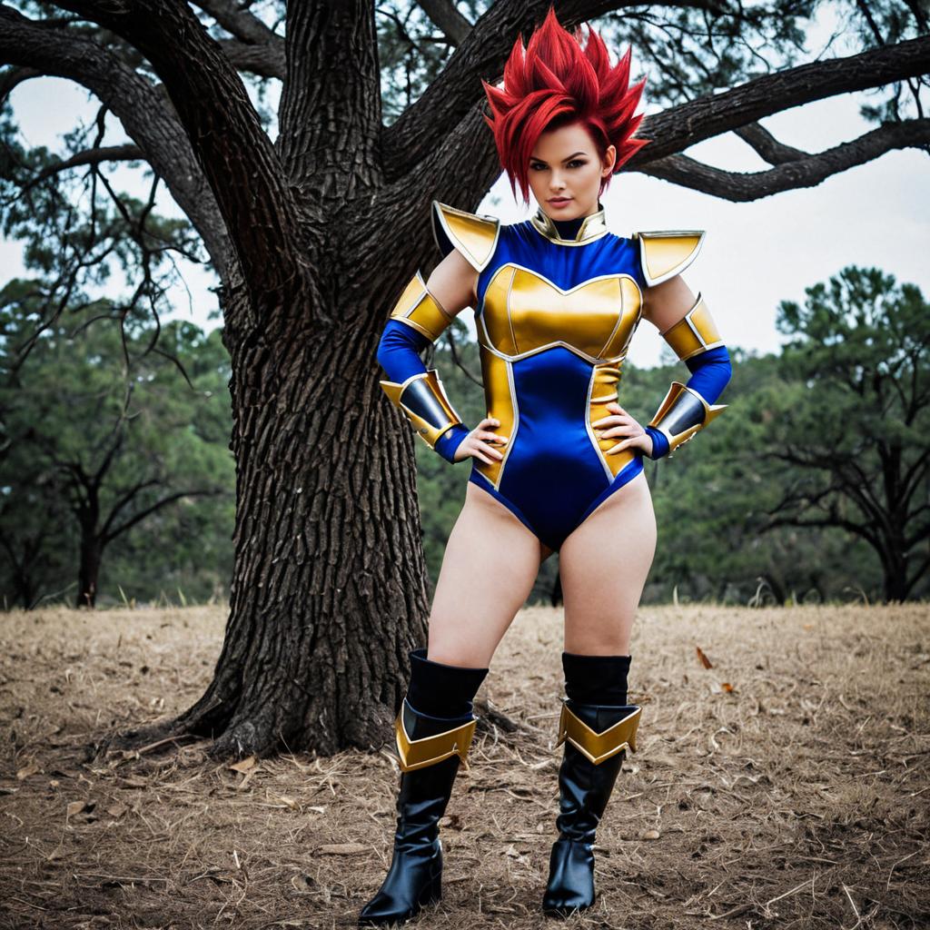 A young woman with spiked red hair dressed in a detailed and realistic female Vegeta cosplay outfit. She wears blue and gold Saiyan armor, including a breastplate, arm bracers, and boots. The cosplay is completed with a blue leotard and armor pieces, standing confidently outdoors in front of a large tree and forest background.