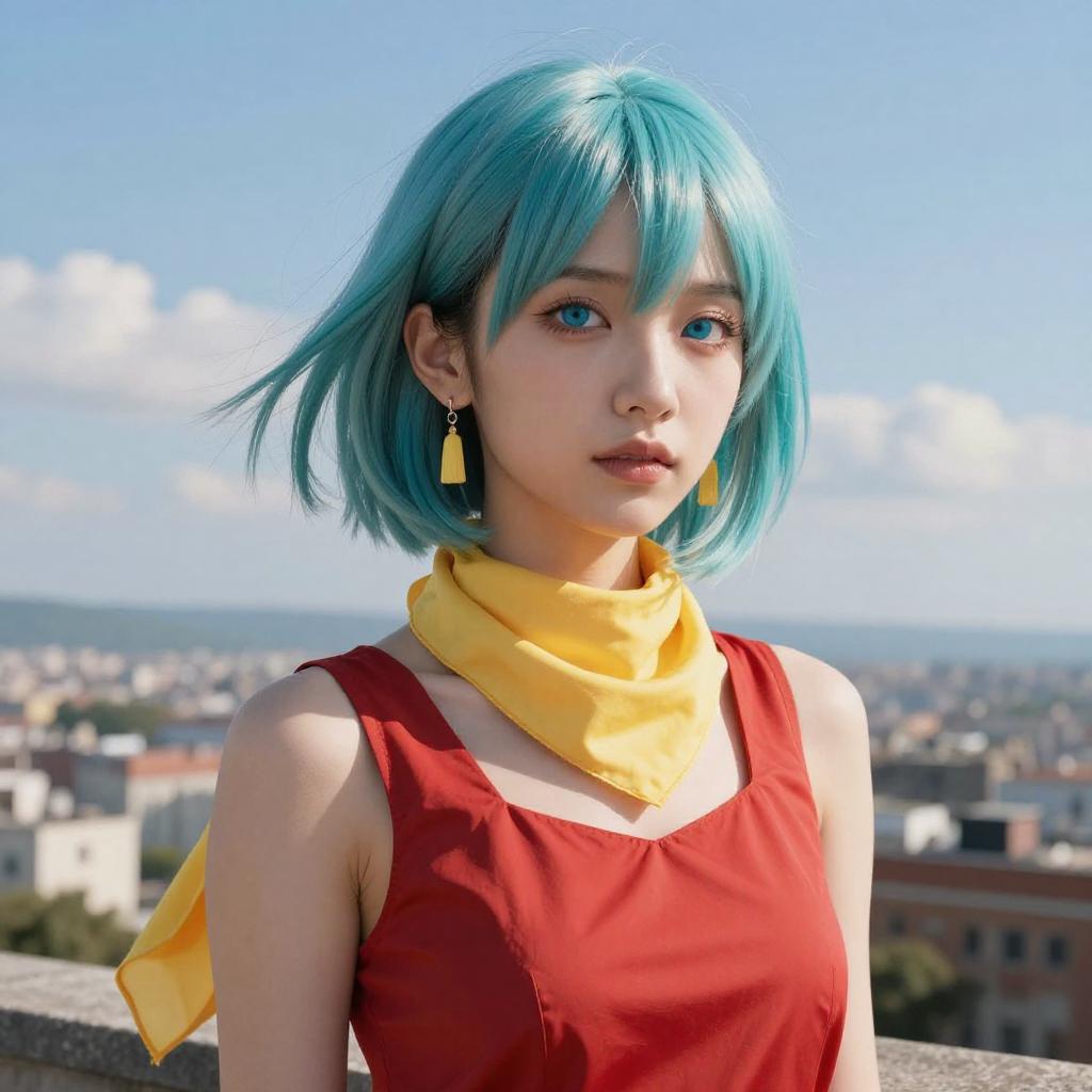 Photorealistic portrait of a young woman with aqua blue short hair and striking blue eyes, wearing a red sleeveless dress and a yellow scarf around her neck. She also wears yellow tassel earrings. The background shows a cityscape under a clear blue sky with soft clouds, suggesting an outdoor urban setting.