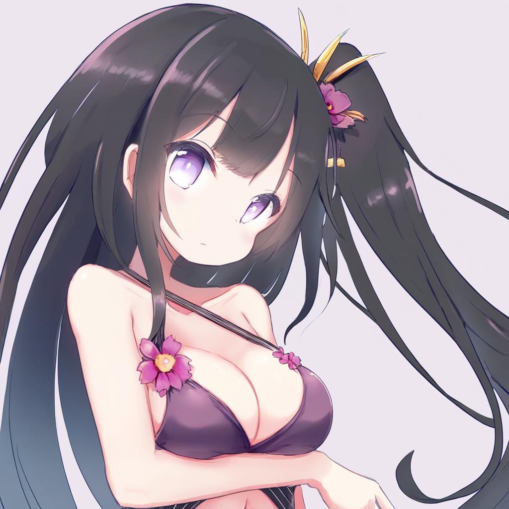 Architect (girls' frontline), girls' frontline, 1girl, pink eyes, purple eyes, black hair, very long hair, side ponytail, hair ornament, medium breasts, large breasts, cleavage, navel, collarbone, bare shoulders, pink nails, nail polish, one side up, by artist maiku, leet