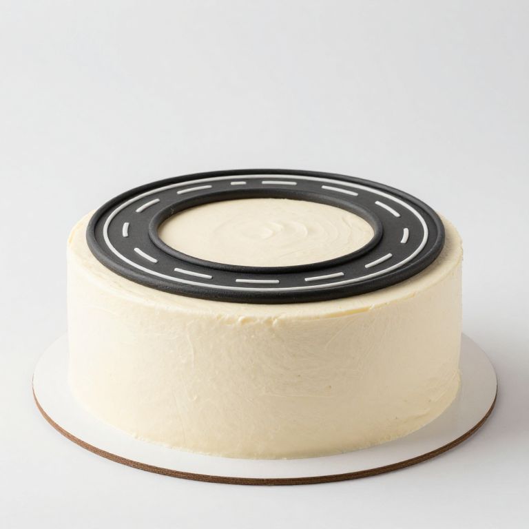Photograph of a round, cream-colored cake with a smooth, even surface. The cake is topped with a black, circular cake topper featuring white dashed lines, resembling a road or wheel. The cake sits on a simple white cake board with a brown edge. The background is pure white, making the cake the focal point. The cake's texture appears soft and slightly domed, with a clean, minimalistic presentation. The topper adds a modern, industrial touch to the otherwise traditional dessert.