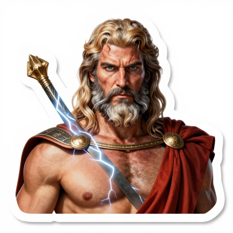 Bumper Sticker Realistic illustration of Zeus, the lightning god, ultra realistic, upper body, [facing the camera]::10,