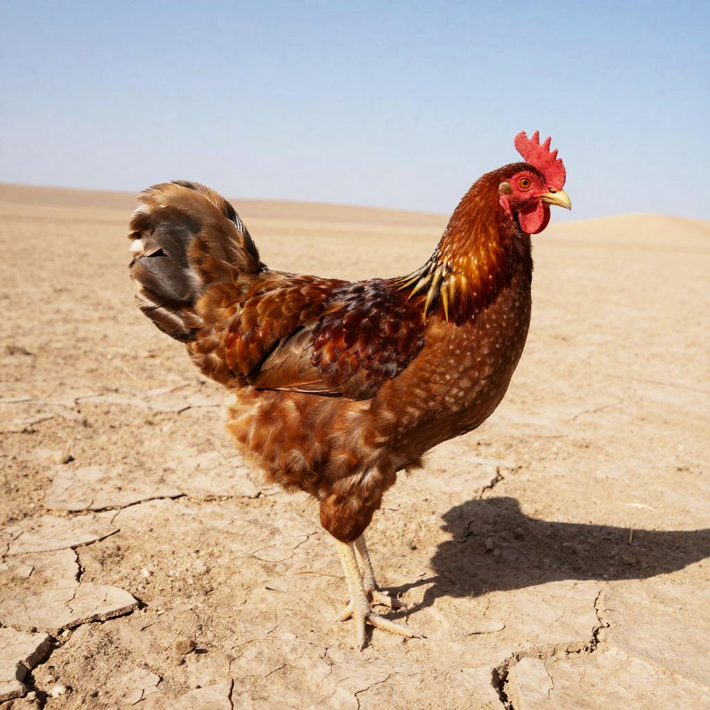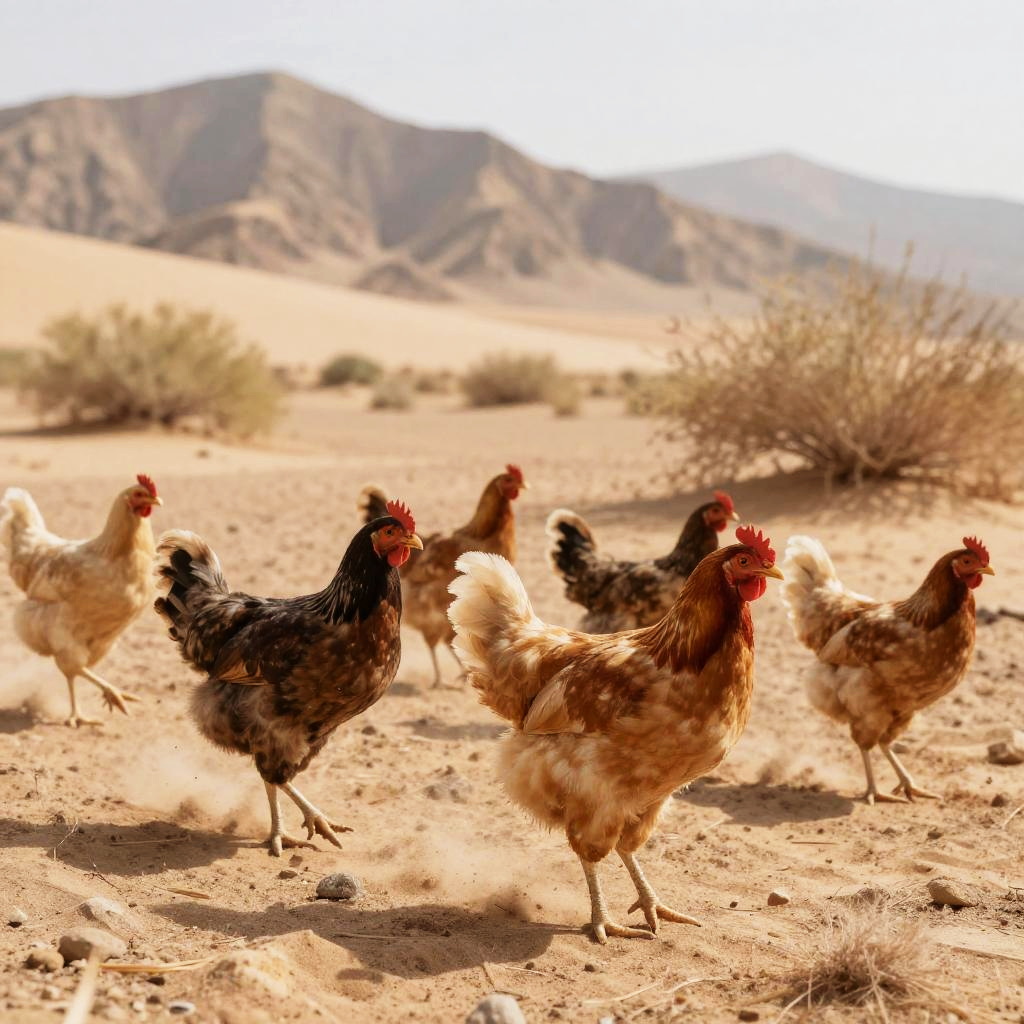A flock of desert chickens wandering through sunlit desert terrain, dusty mountains in the background, emphasizing textures of sand, feathers, and dry flora in warm tones.