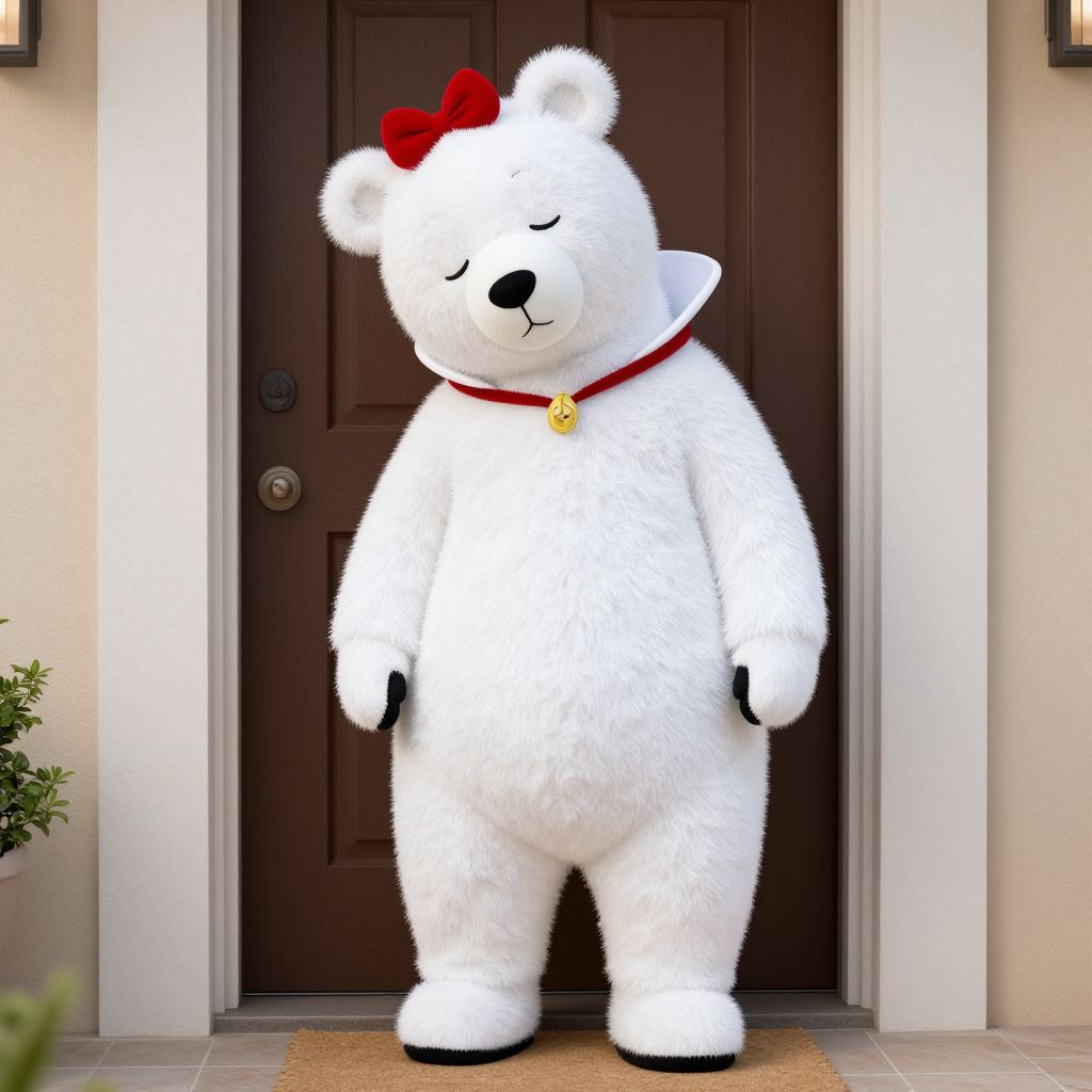Sleepy Snow White Costume, in a white bear costume standing in front of a door