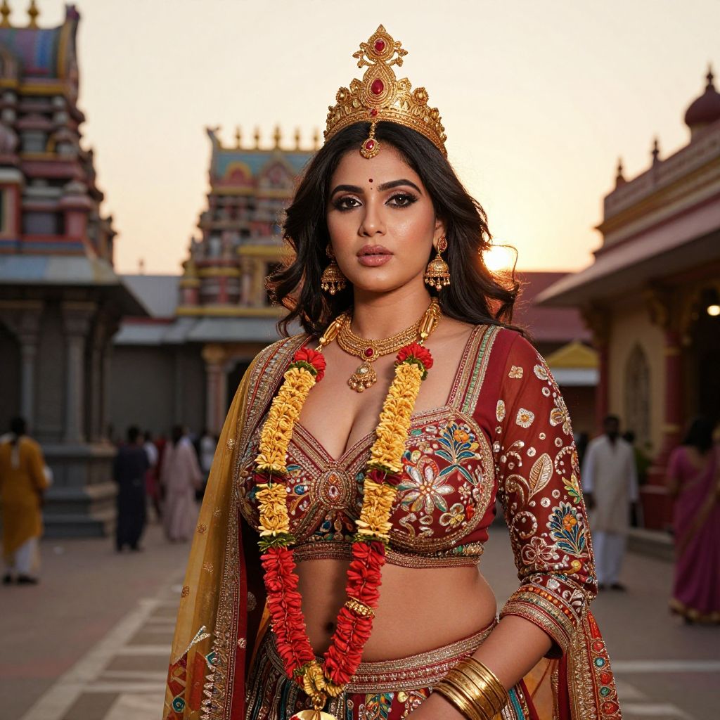 A beautiful woman with big tits and a sexy allure, wearing a traditional Indian outfit with intricate embroidery, a golden and red garland flowing around her neck, and a stunning gold crown on her head, standing in a vibrant temple courtyard under a golden sunset, her eyes sparkling with grace and confidence, the scene filled with rich colors and cultural elegance.