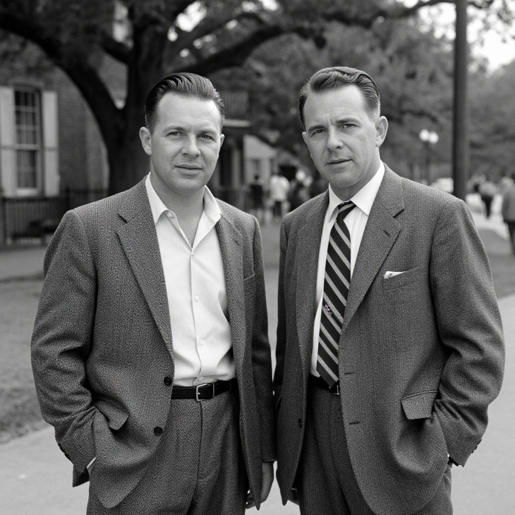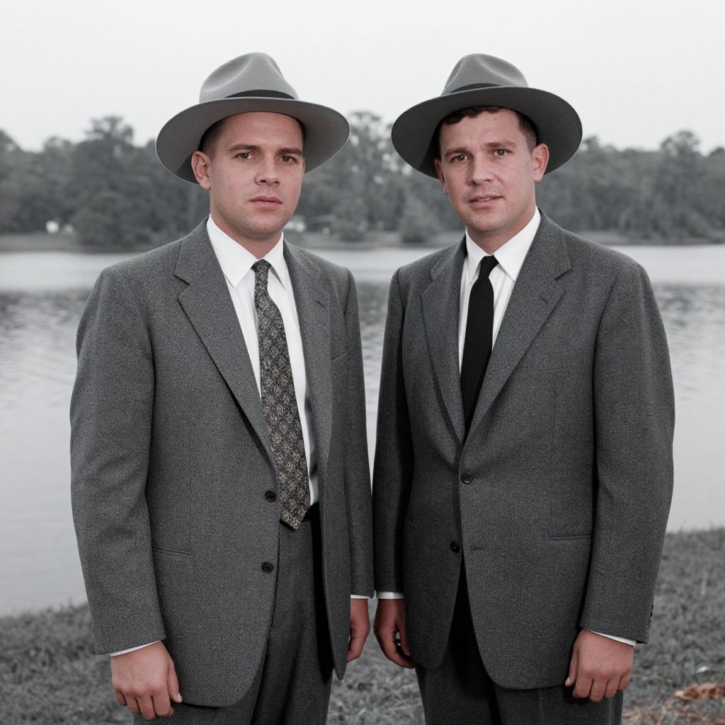 Photograph of two Caucasian men in gray suits, white shirts, black ties, and gray fedoras, standing side by side by a lake.