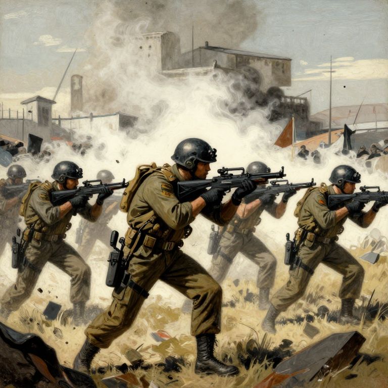Professional Soldiers in battlefield, illustration in the style of Aveline Stokart, strong composition,